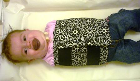 Every day I have to change out her trach ties (aka the straps that go around her neck to hold the tracheostomy in). I usually swaddle Maaike in a receiving blanket to get the job done, but she has now figured out how to wriggle her arms out. Last week as I was cleaning the wound area she got one of her arms out, reached up, and decannulated herself (aka pulled the tracheostomy out of her throat!)! I stayed calm and cool in the moment, but after I got it back in her neck I let myself have a freak out. As trach kids get older it becomes more common, often as an attention ploy, but 7 months is a little young for that. So, for now, arm restraints it is. But, at least I made it pretty!